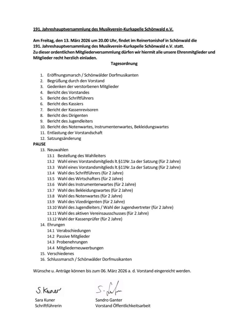 Am 26.12.2025 findet unser traditionelles Jahreskonzert in der Uhrmacher-Ketterer-Halle in Schönwald statt und wir freuen uns schon sehr auf einen schönen Abend mit euch!